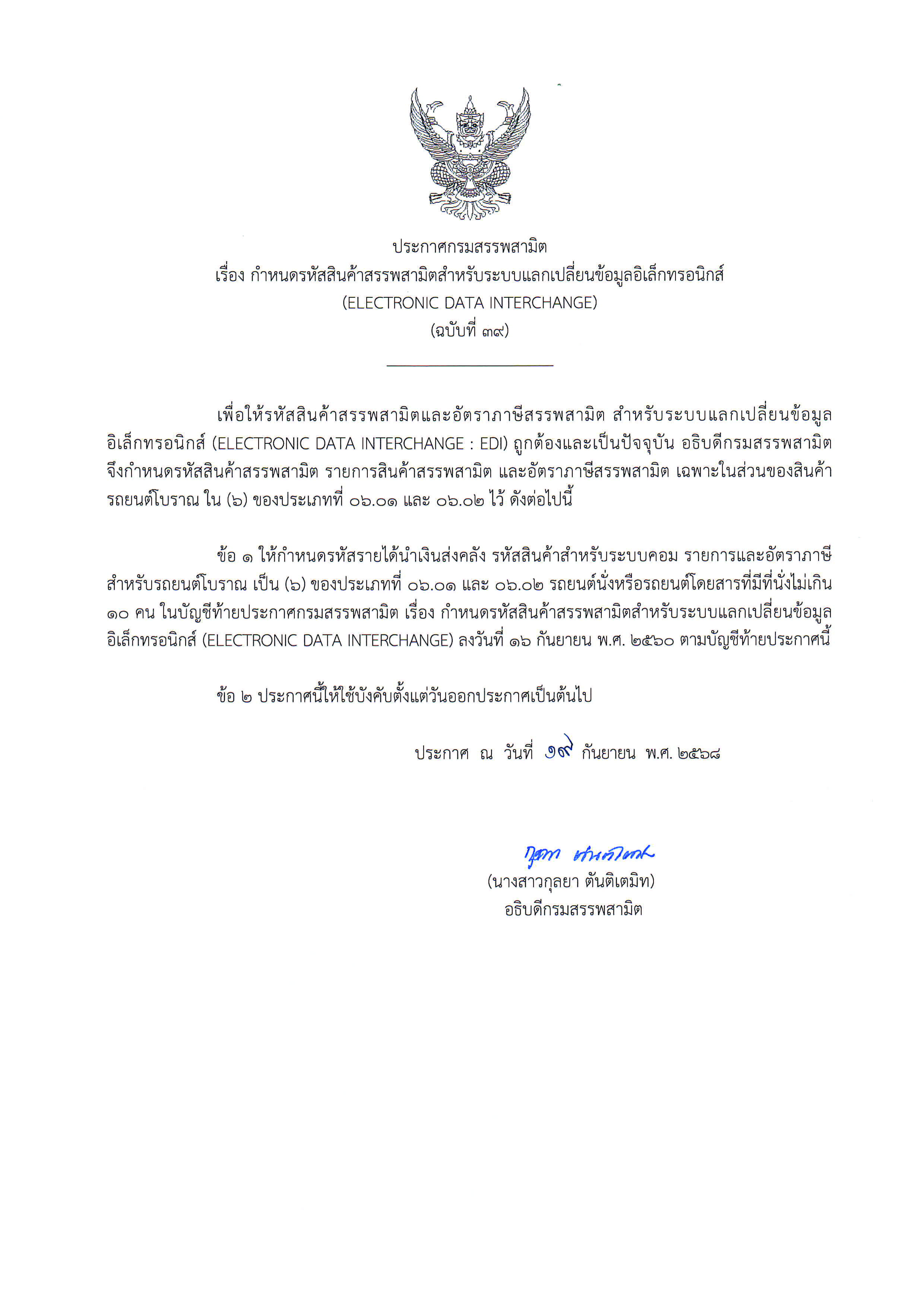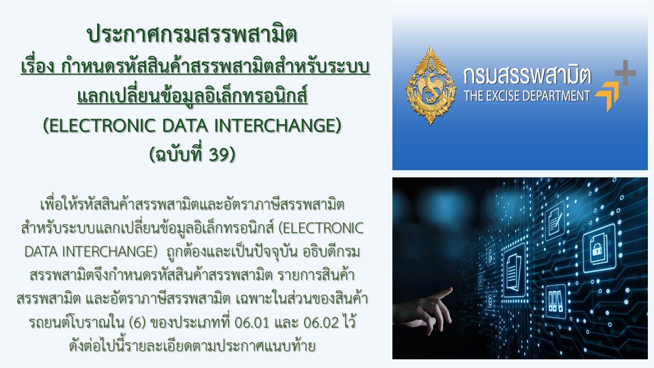 ประกาศกรมสรรพสามิต เรื่องกำหนดรหัสสินค้าสรรพสามิตสำหรับระบบ แลกเปลี่ยนข้อมูลอิเล็กทรอนิกส์ ฉบับที่39
