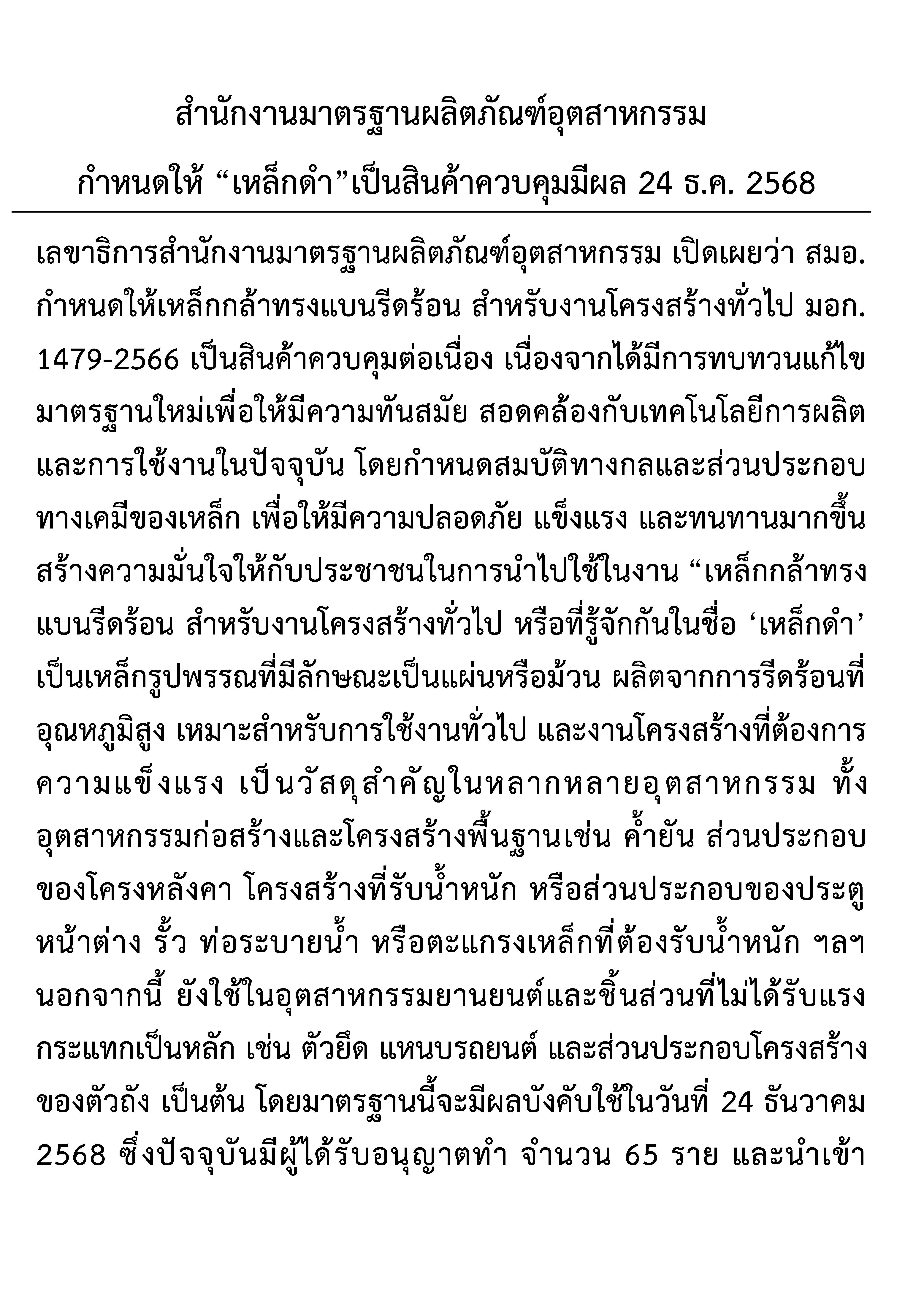 สำนักงานมาตรฐานผลิตภัณฑ์อุตสาหกรรม กำหนดให้ "เหล็กดำ" เป็นสินค้าควบคุมมีผล 24 ธ.ค. 2568