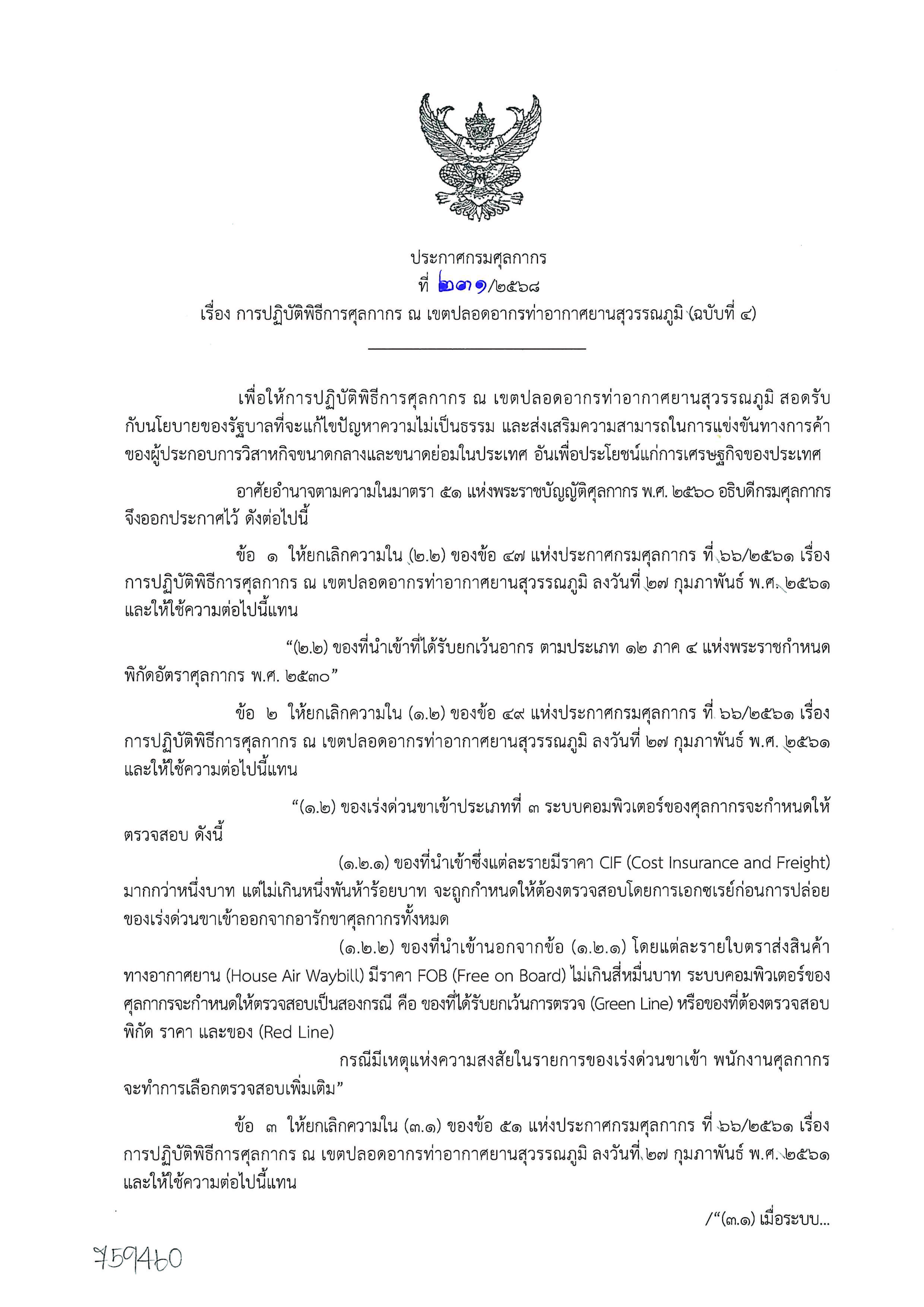 ประกาศกรมศุลกากรที่231/2568 เรื่องการปฏิบัติพิธีการศุลกากร ณ เขตปลอดอากรท่าอากาศยานสุวรรณภูมิ