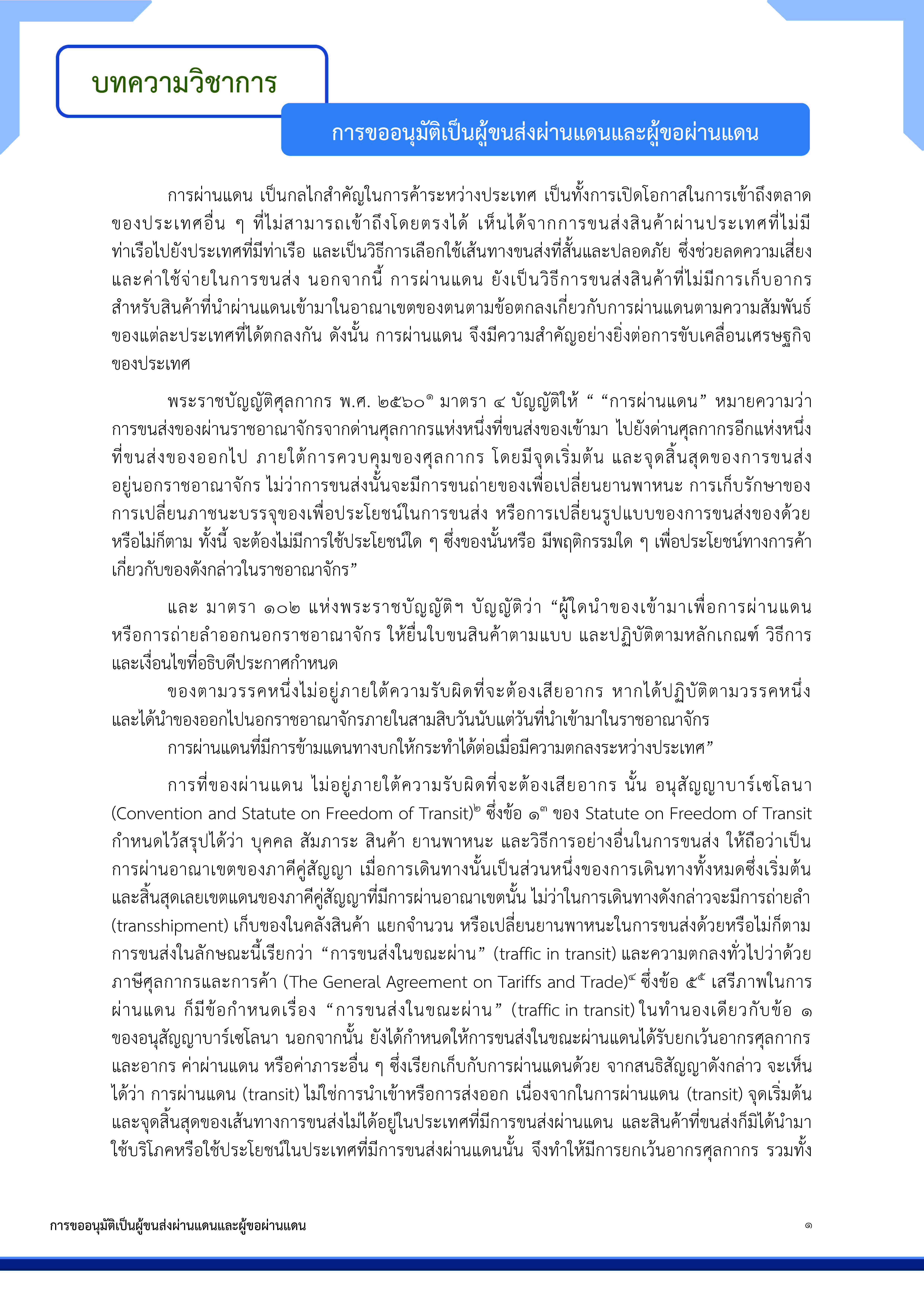 กรมศุลกากร ประชาสัมพันธ์ บทความวิชาการ การขออนุมัติเป็นผู้ขนส่งผ่านแดนและผู้ขอผ่านแดน