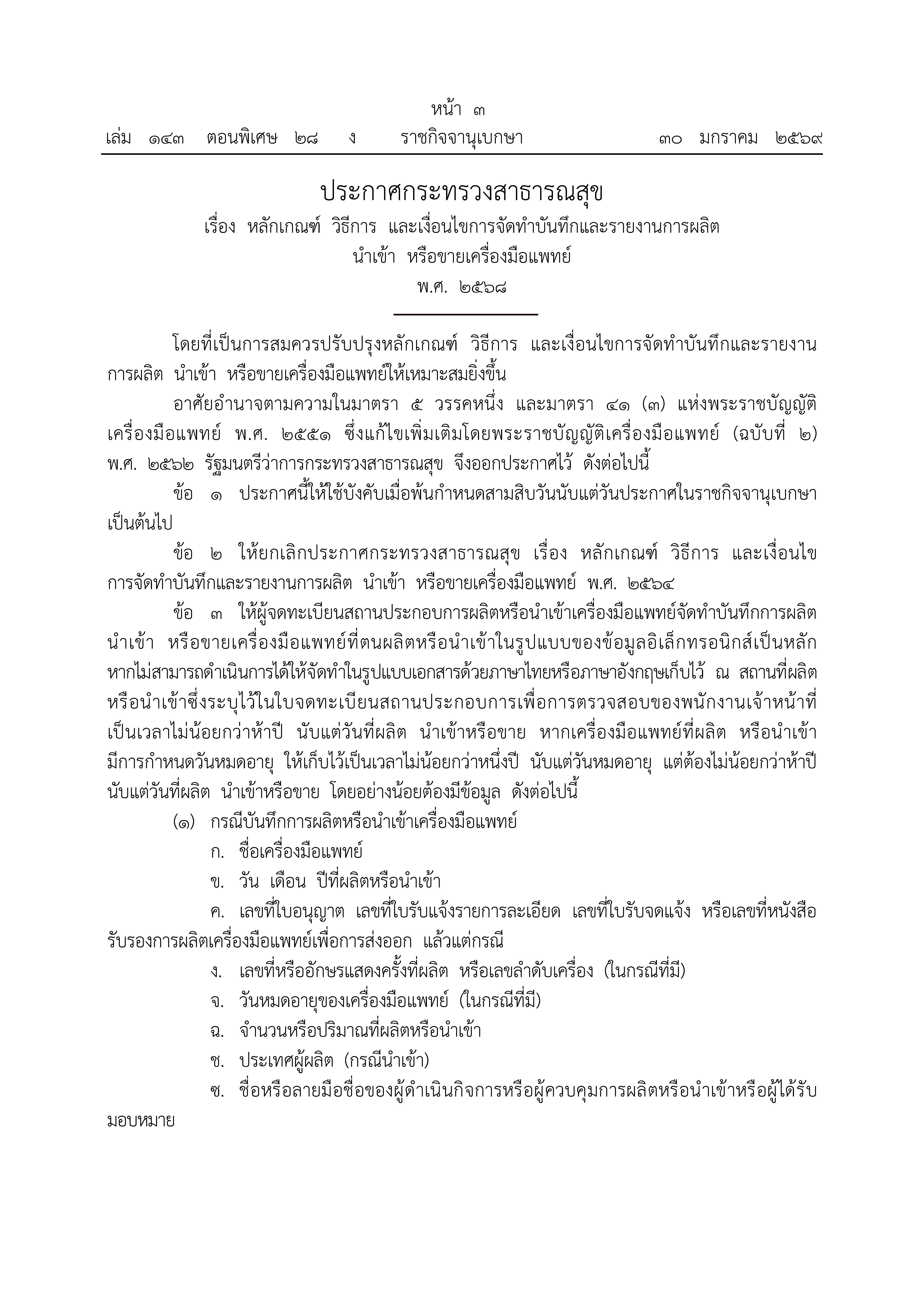 ประกาศกระทรวงสาธารณสุข เรื่อง หลักเกณฑ์ วิธีการ และเงื่อนไขการ จัดทำบันทึกและรายงานการผลิตฯ