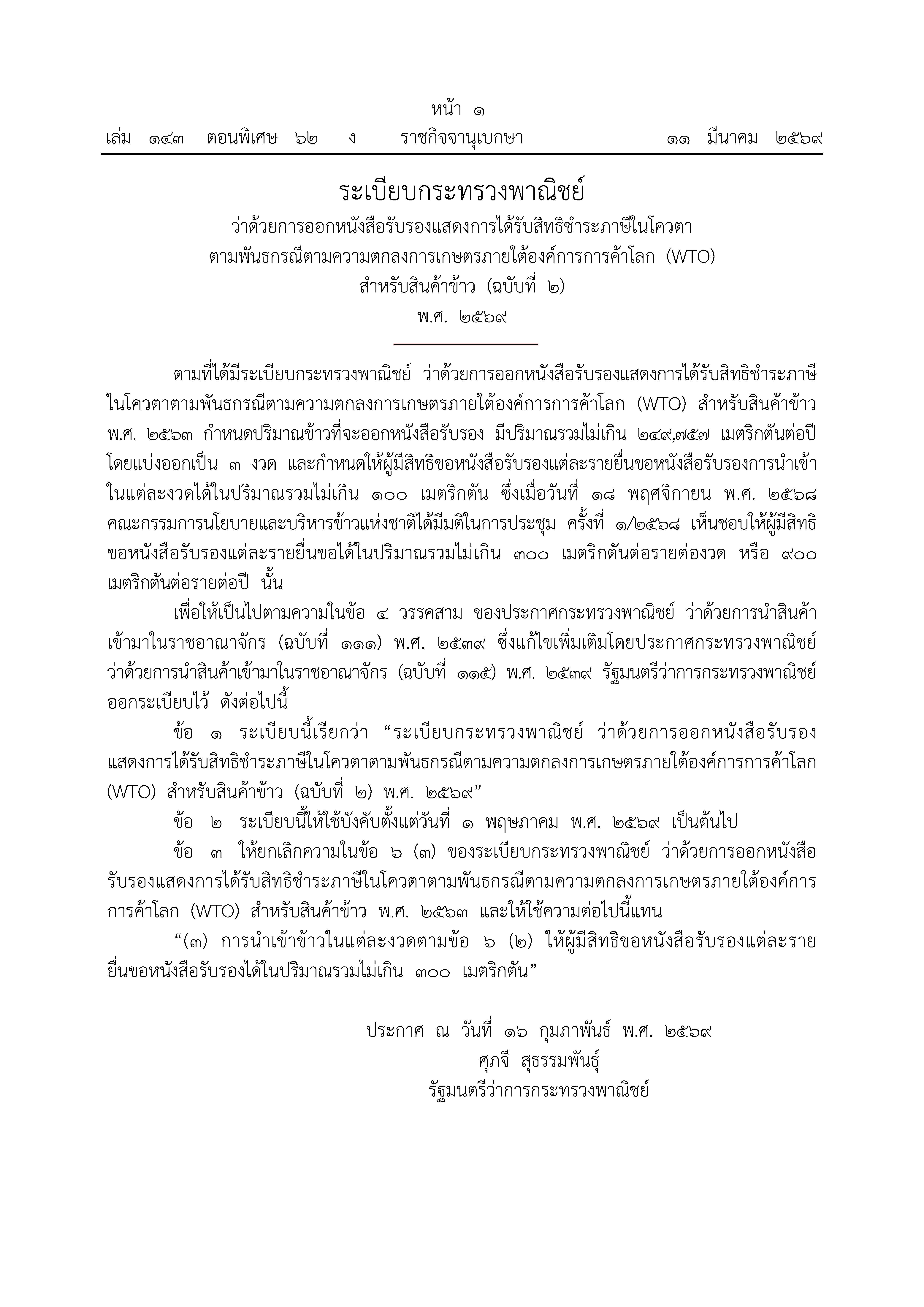 ระเบียบกระทรวงพาณิชย์ ว่าด้วยการออกหนังสือรับรองแสดง การได้รับสิทธิชำระภาษี ในโควตาตามพันธกรณีฯ