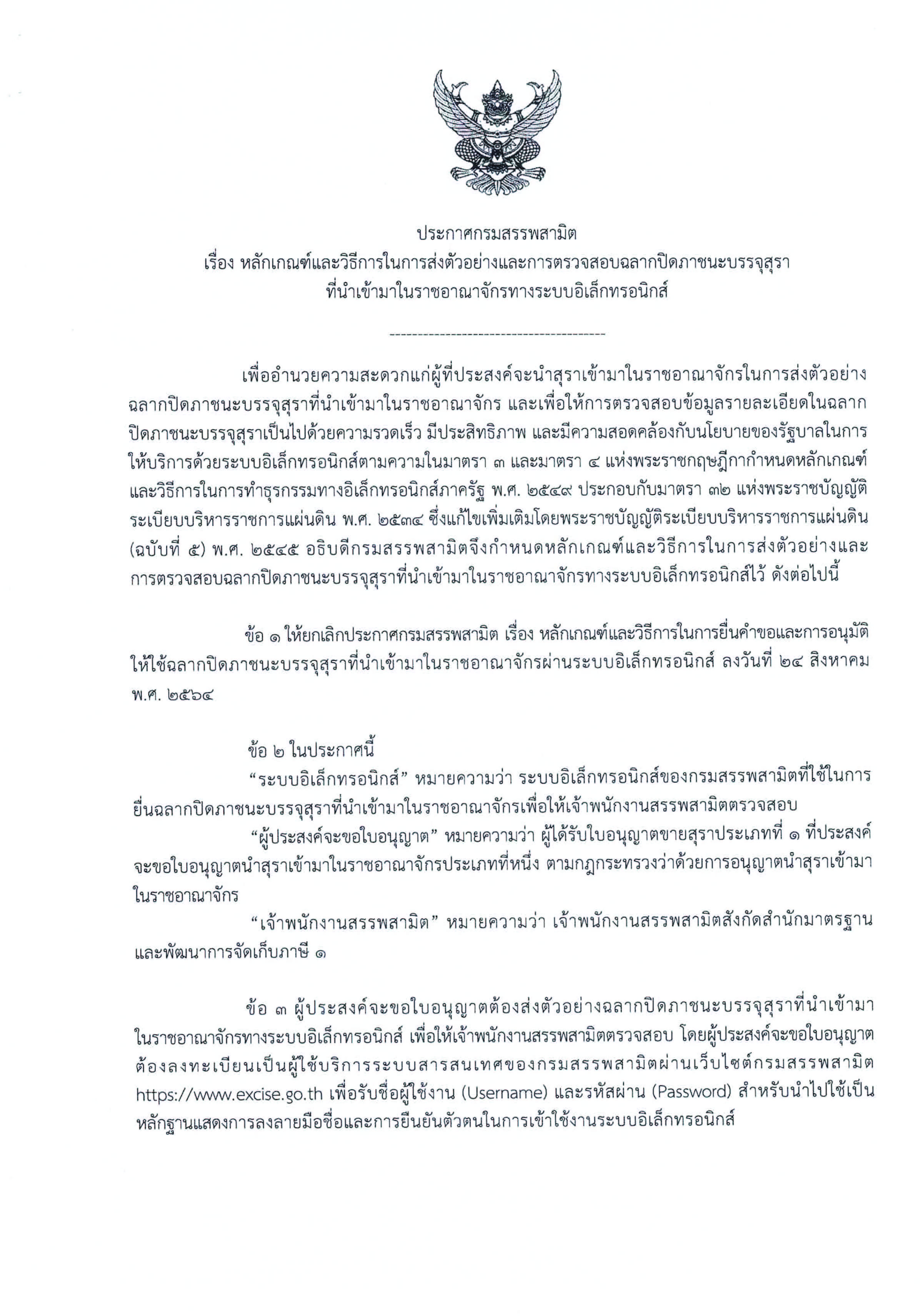ประกาศกรมสรรพสามิต เรื่อง หลักเกณฑ์และวิธีการในการส่งตัวอย่างและ การตรวจสอบฉลากปิดภาชนะบรรจุสุรา