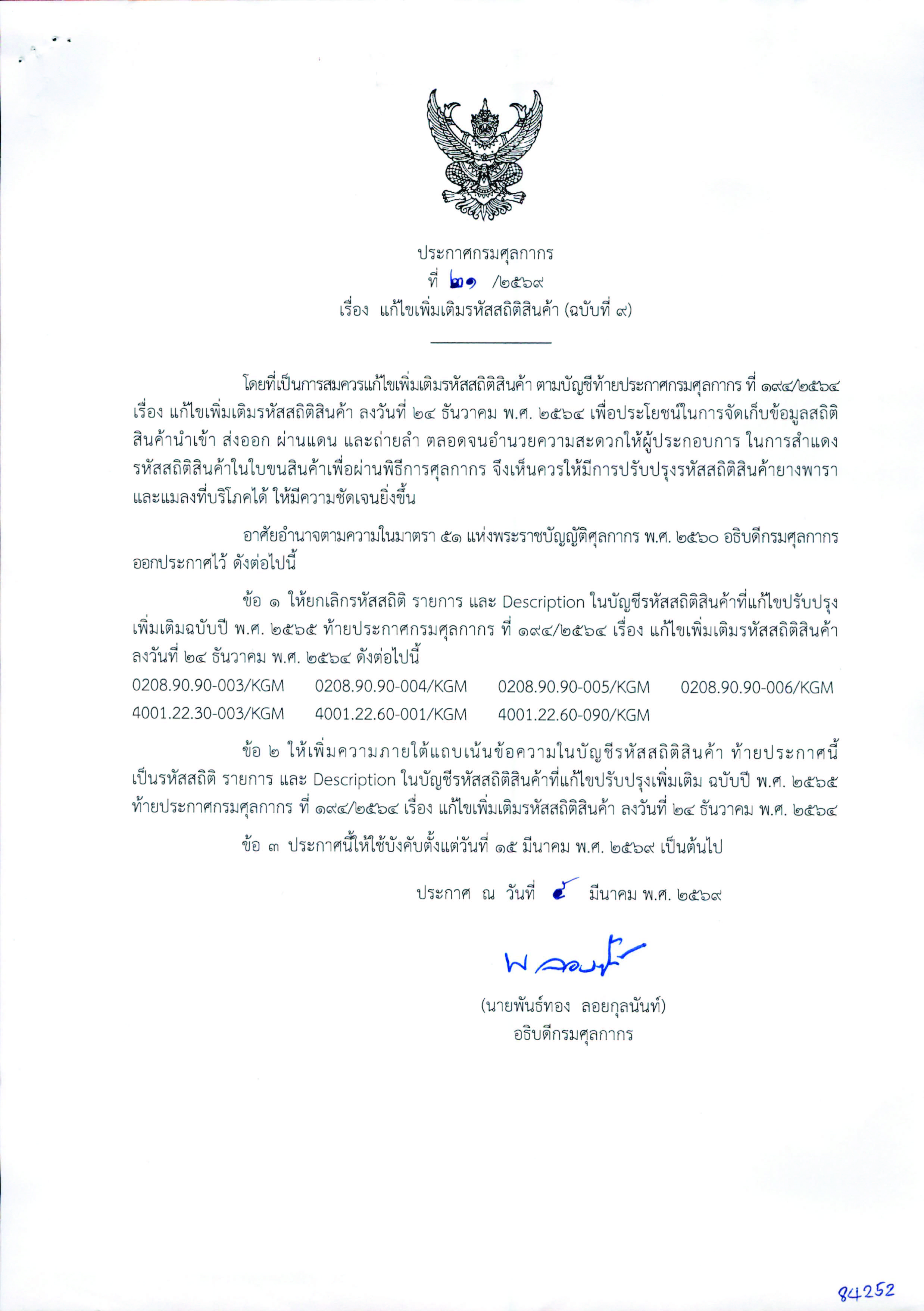 ประกาศกรมศุลกากรที่ 21/2569 เรื่องแก้ไขเพิ่มเติมรหัสสิถิติสินค้า (ฉบับที่ 9)