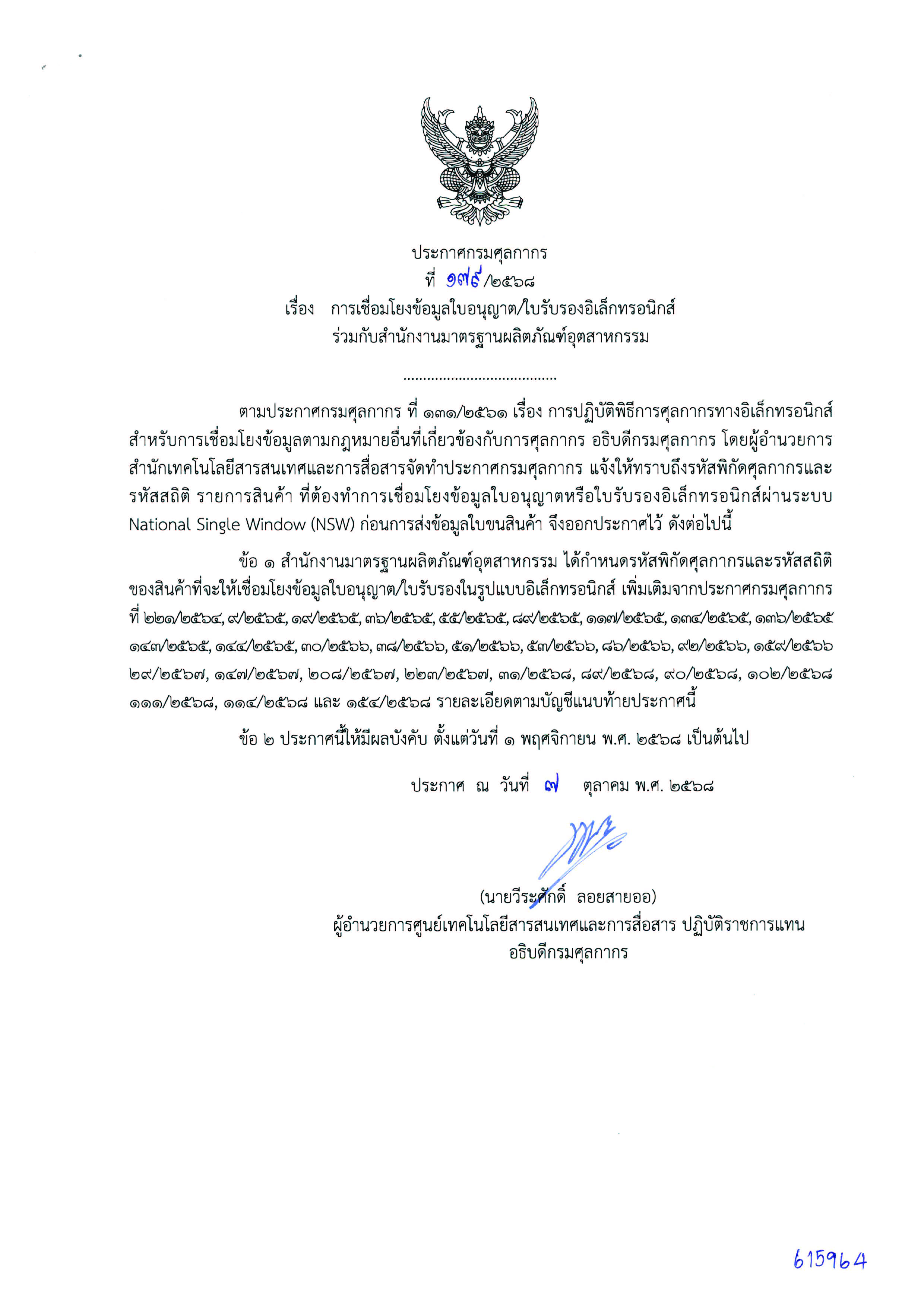 ประกาศกรมศุลกากรที่ 179/2568 เรื่องการเชื่อมโยงข้อมูลใบอนุญาต/ใบรับรองอิเล็กพรอนิกส์ร่วมกับ สมอ.