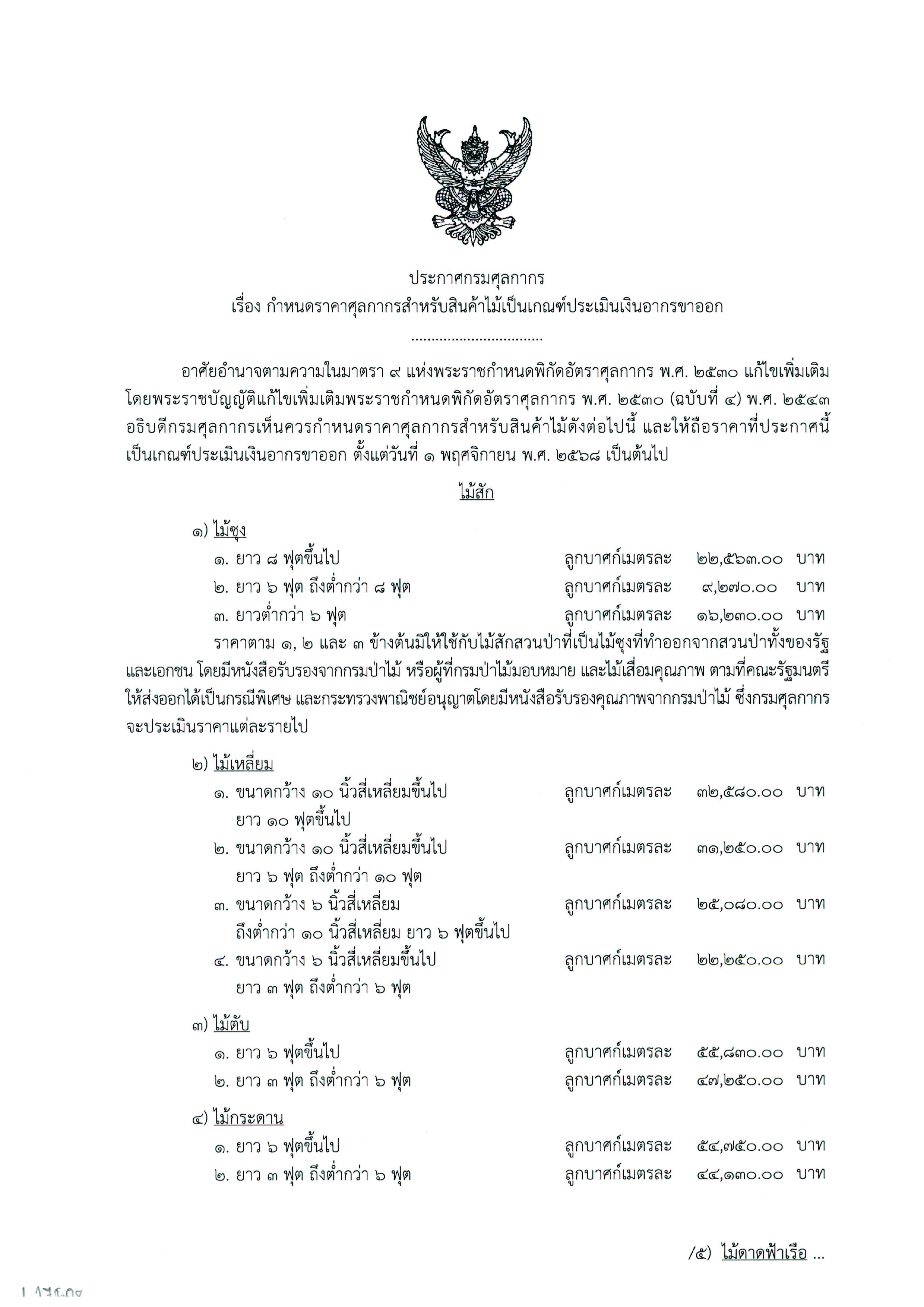 ประกาศกรมศุลกากร เรื่องกำหนดราคาศุลกากรสำหรับสินค้าไม้ เป็นเกณฑ์ประเมินเงินอากรขาออก
