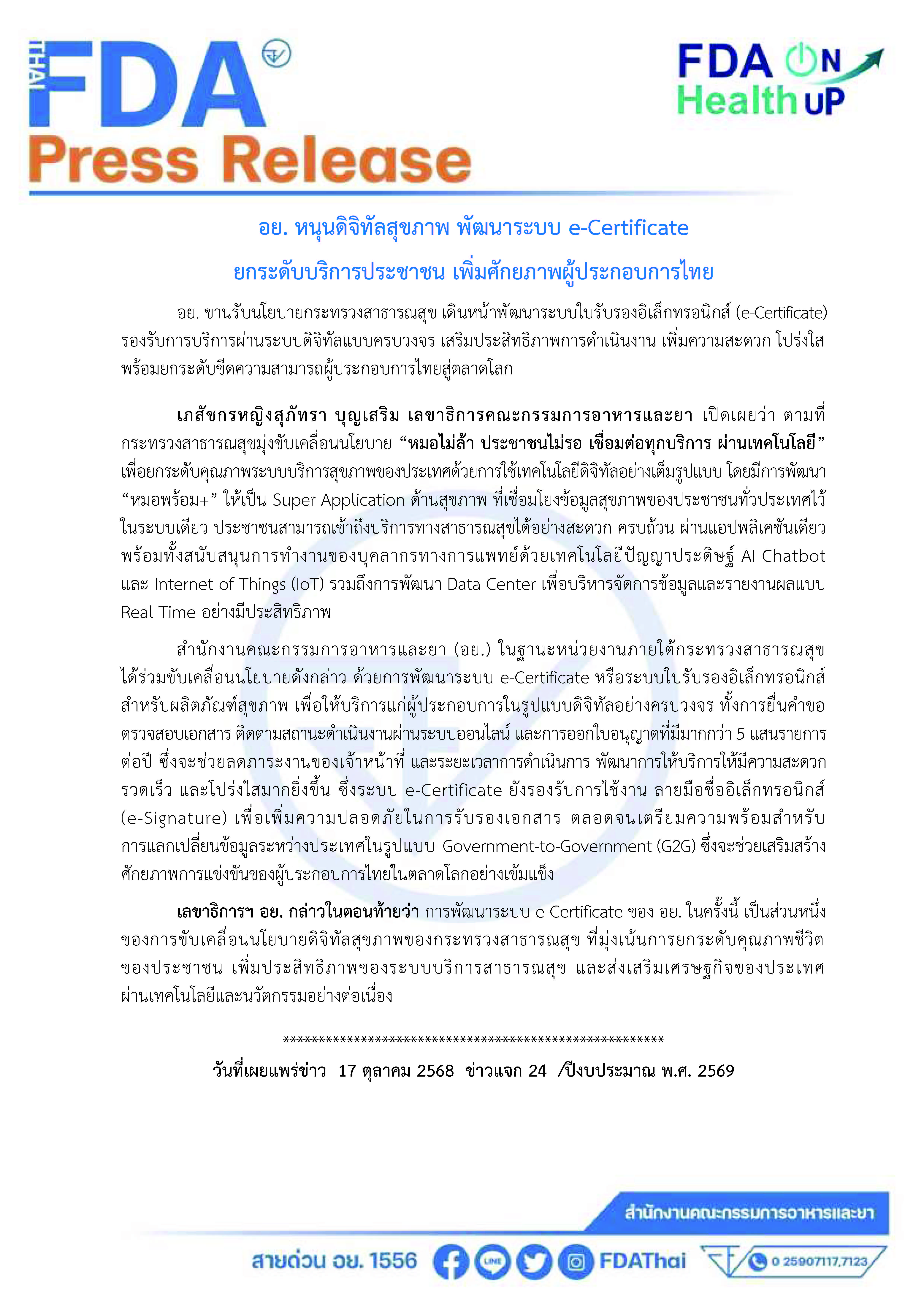 สำนักงานคณะกรรมการอาหารและยา หนุนดิจิทัลสุขภาพ พัฒนาระบบ e-Certificate ยกระดับการ บริการเพิ่มศักยภาพ