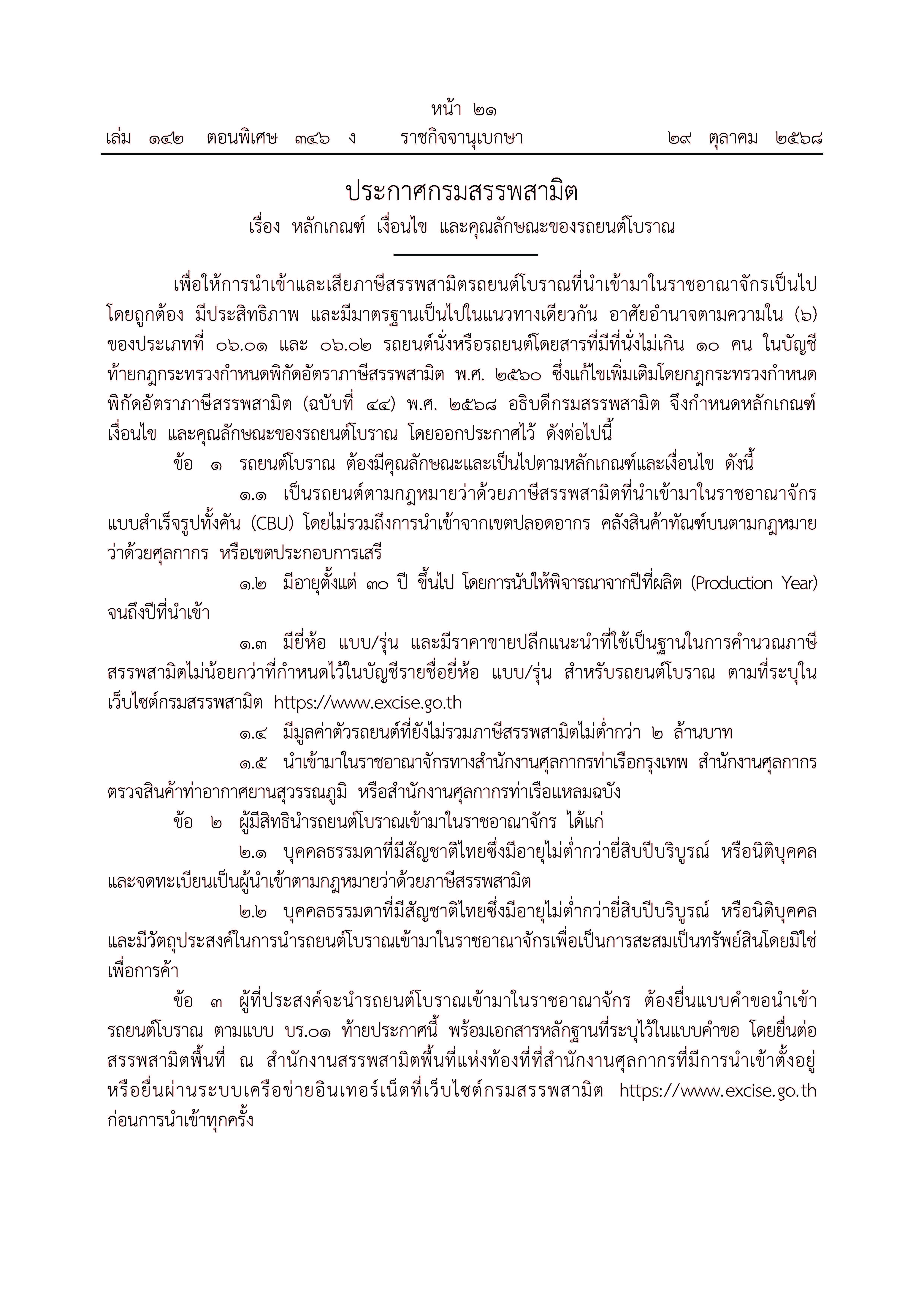 ประกาศกรมสรรพสามิต เรื่อง หลักเกณฑ์ เงื่อนไข และ คุณลักษณะของรถยนต์โบราณ