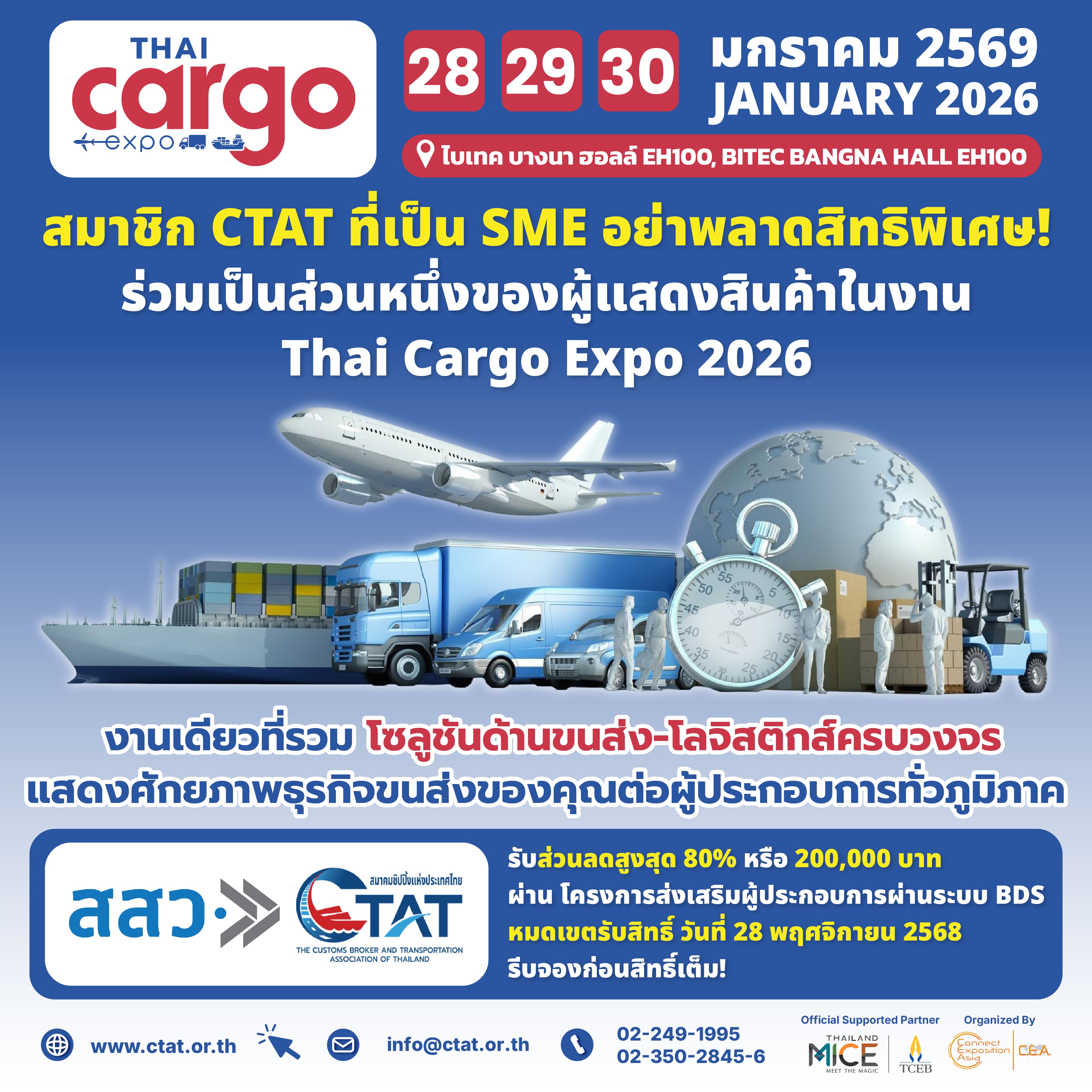 สมาคมฯ ขอประชาสัมพันธ์งาน Thai Cargo Expo 2026 ซึ่งเป็นงานแสดงสินค้าด้านการขนส่งและโลจิสติกส์ที่ยิ่งใหญ่ระดับประเทศ พบกับผู้ประกอบการจากทั่วภูมิภาค และโอกาสในการสร้างเครือข่ายธุรกิจอย่างครบวงจร