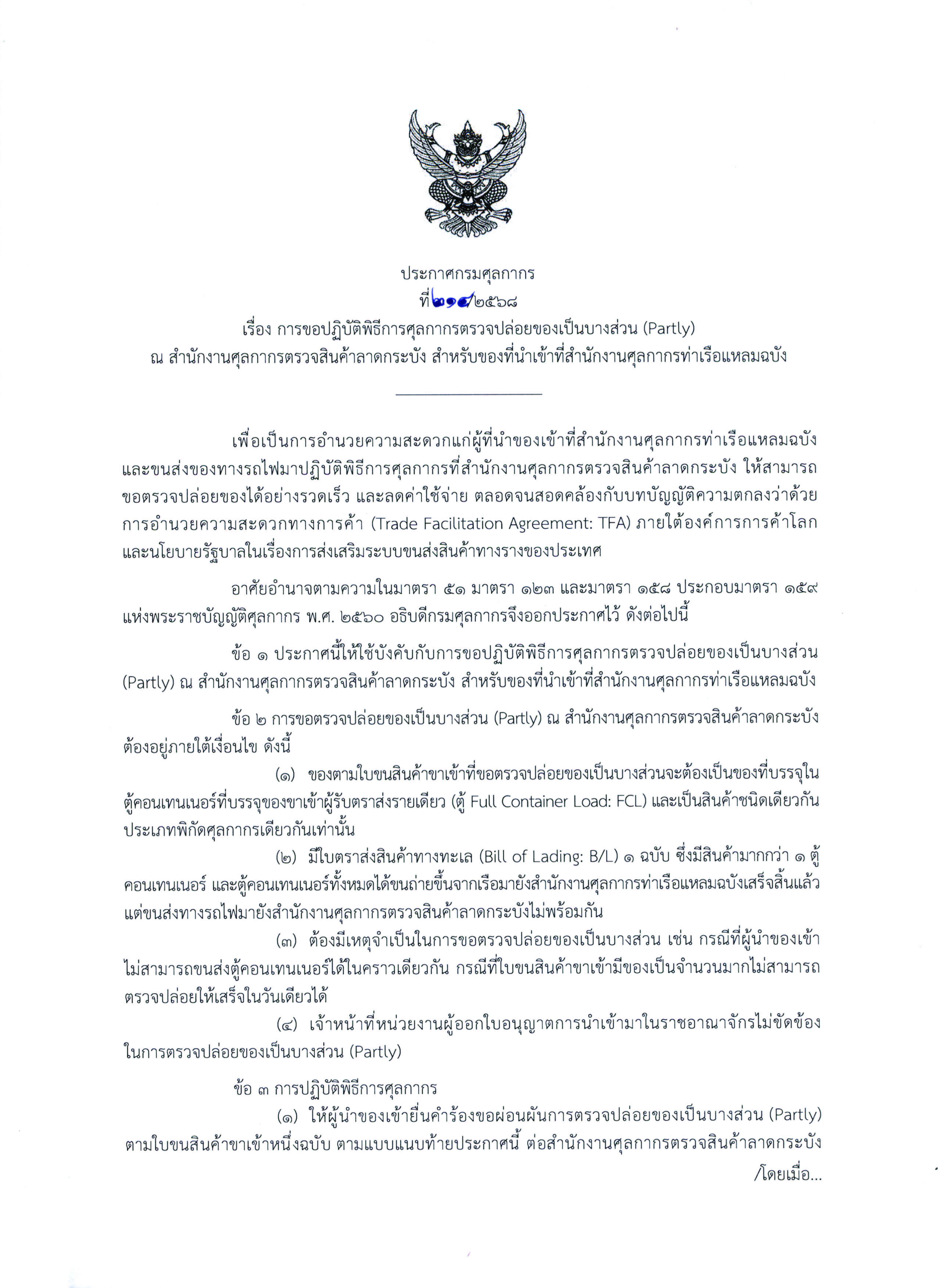 ประกาศกรมศุลกากรที่ 214/2568 เรื่องการขอปฏิบัติพิธีการศุลกากรตรวจปล่อยของเป็น บางส่วน (Partly)