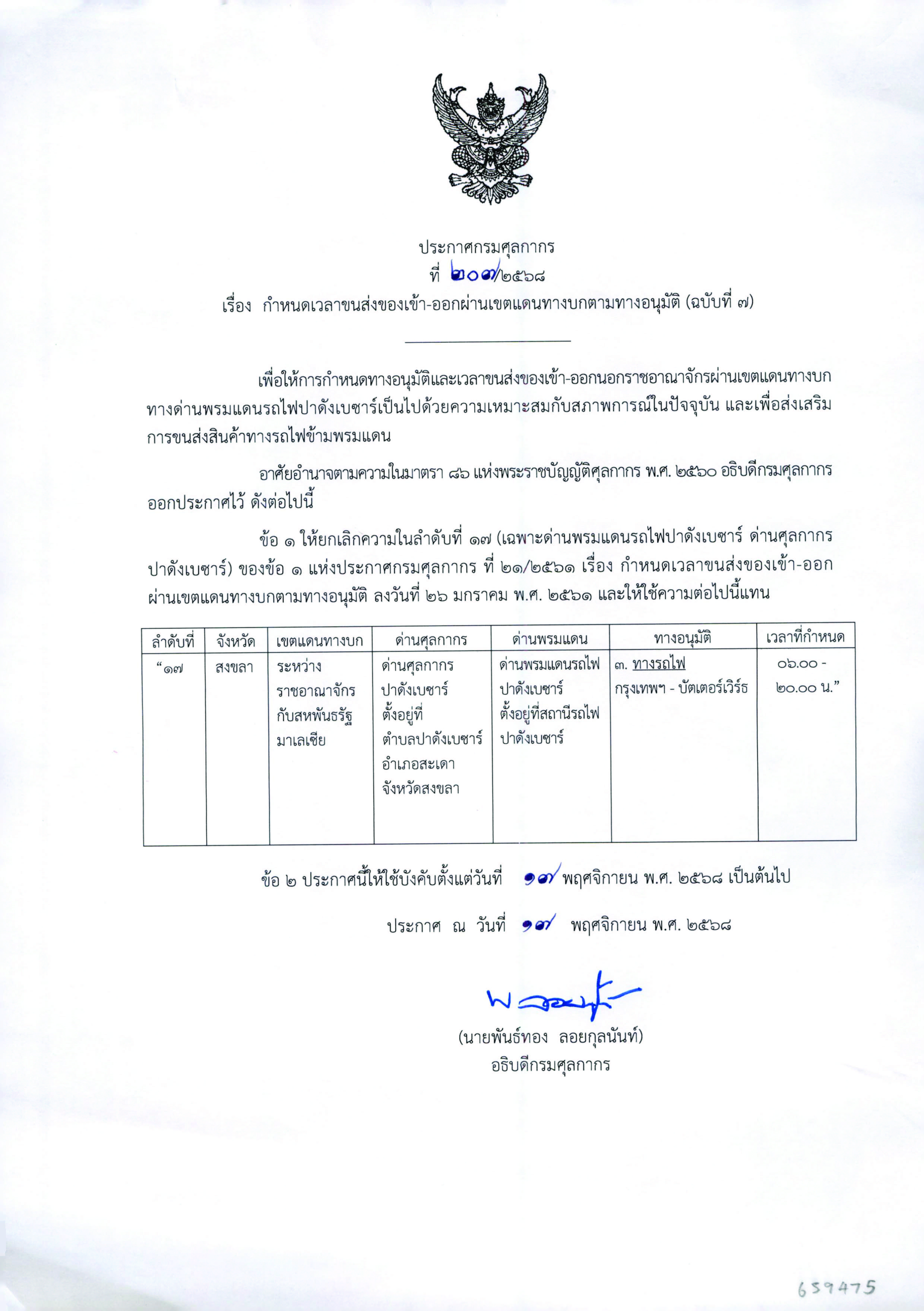 ประกาศกรมศุลกากรที่ 207/2568 กำหนดเวลาขนส่งของเข้า-ออกผ่านเขตแดนทางบก ตามทางอนุมัติ (ฉบับที่ 7)