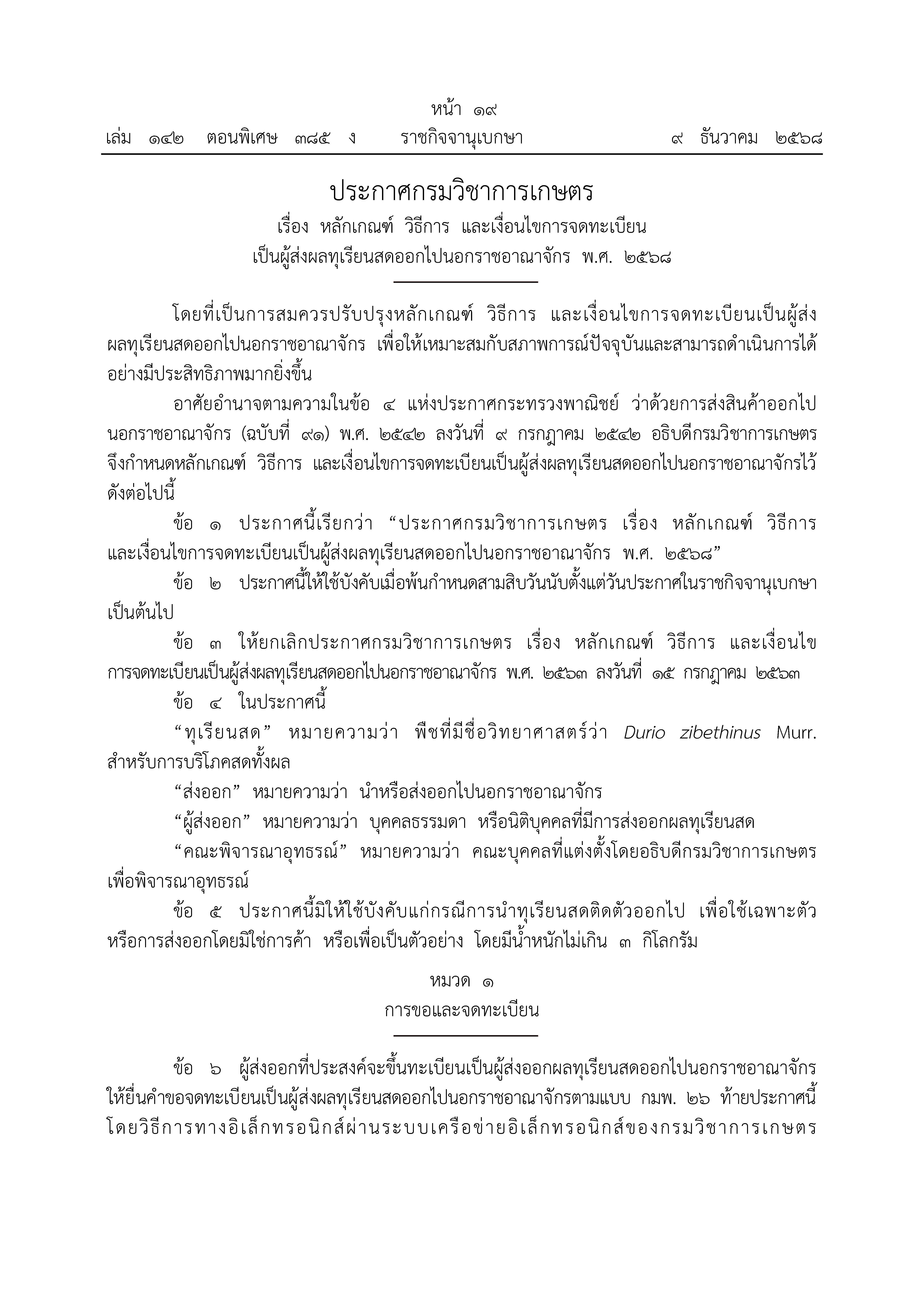 ประกาศกรมวิชาการเกษตร เรื่อง หลักเกณฑ์ วิธีการ และเงื่อนไข การจดทะเบียนเป็นผู้ส่งผลทุเรียนสดฯ
