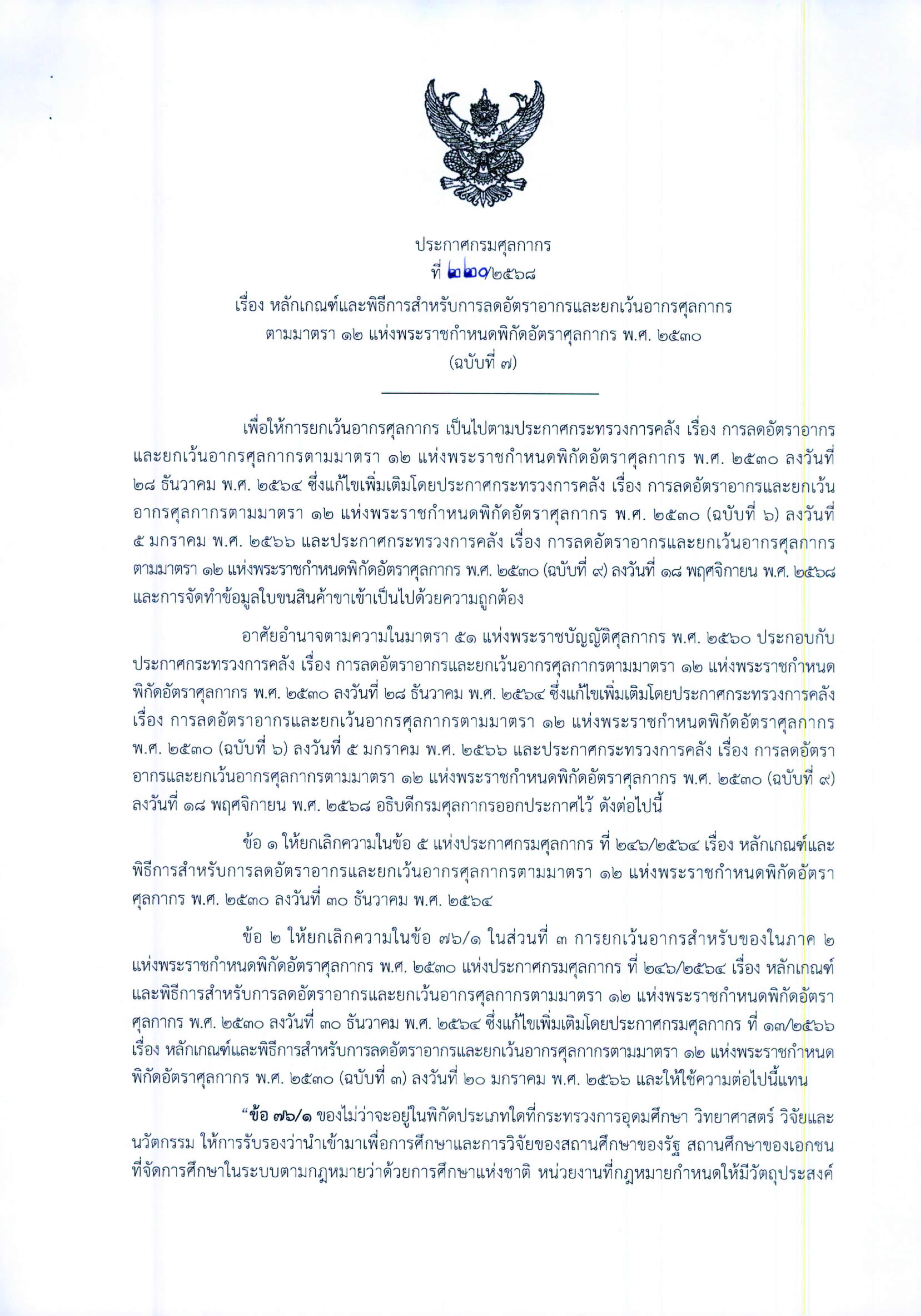 ประกาศกรมศุลกากรที่ 220/2568 เรื่องหลักเกณฑ์และพิธีการสำหรับการลดอัตราอากรและ ยกเว้นอากรศุลกากรฯ