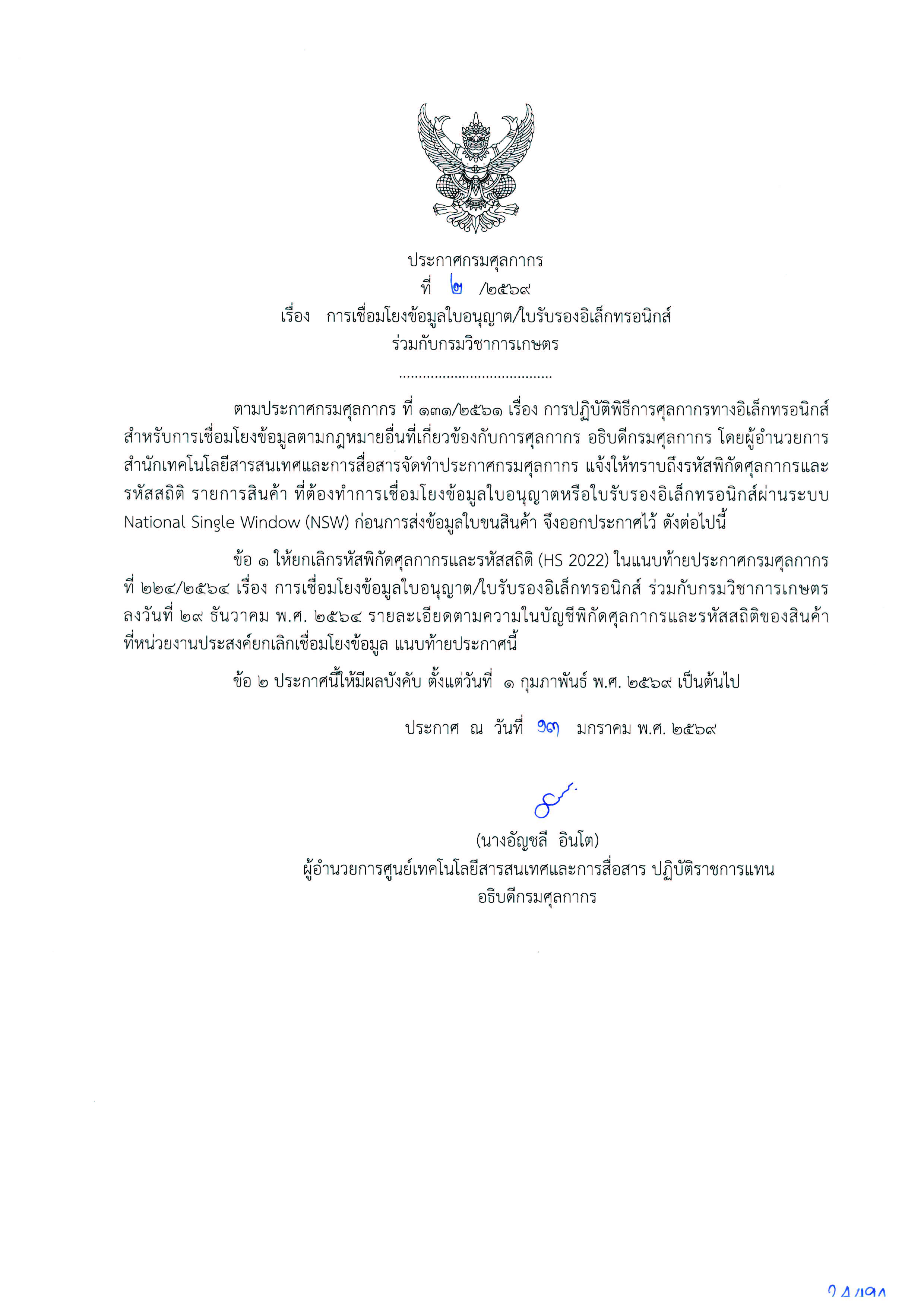 ประกาศกรมศุลกากรที่ 2/2569 เรื่องการเชื่อมโยงข้อมูล/ใบรับรองอิเล็กทรอนิกส์ ร่วมกับกรมวิชาการเกษตร