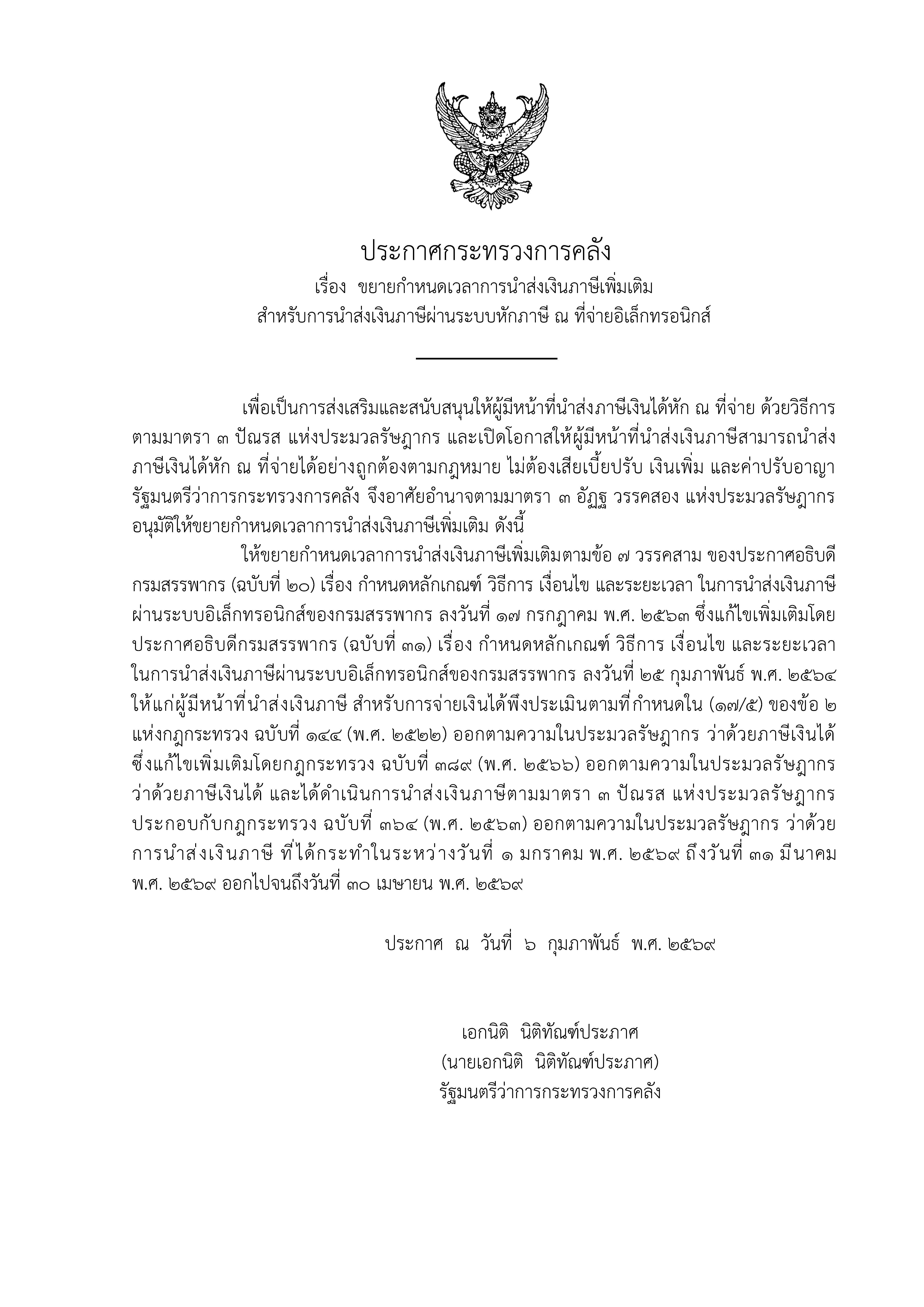 ประกาศกระทรวงการคลัง เรื่องขยายกำหนดเวลาการส่งเงินภาษีเพิ่มเติมสำหรับ การนำเงินส่งภาษีฯ