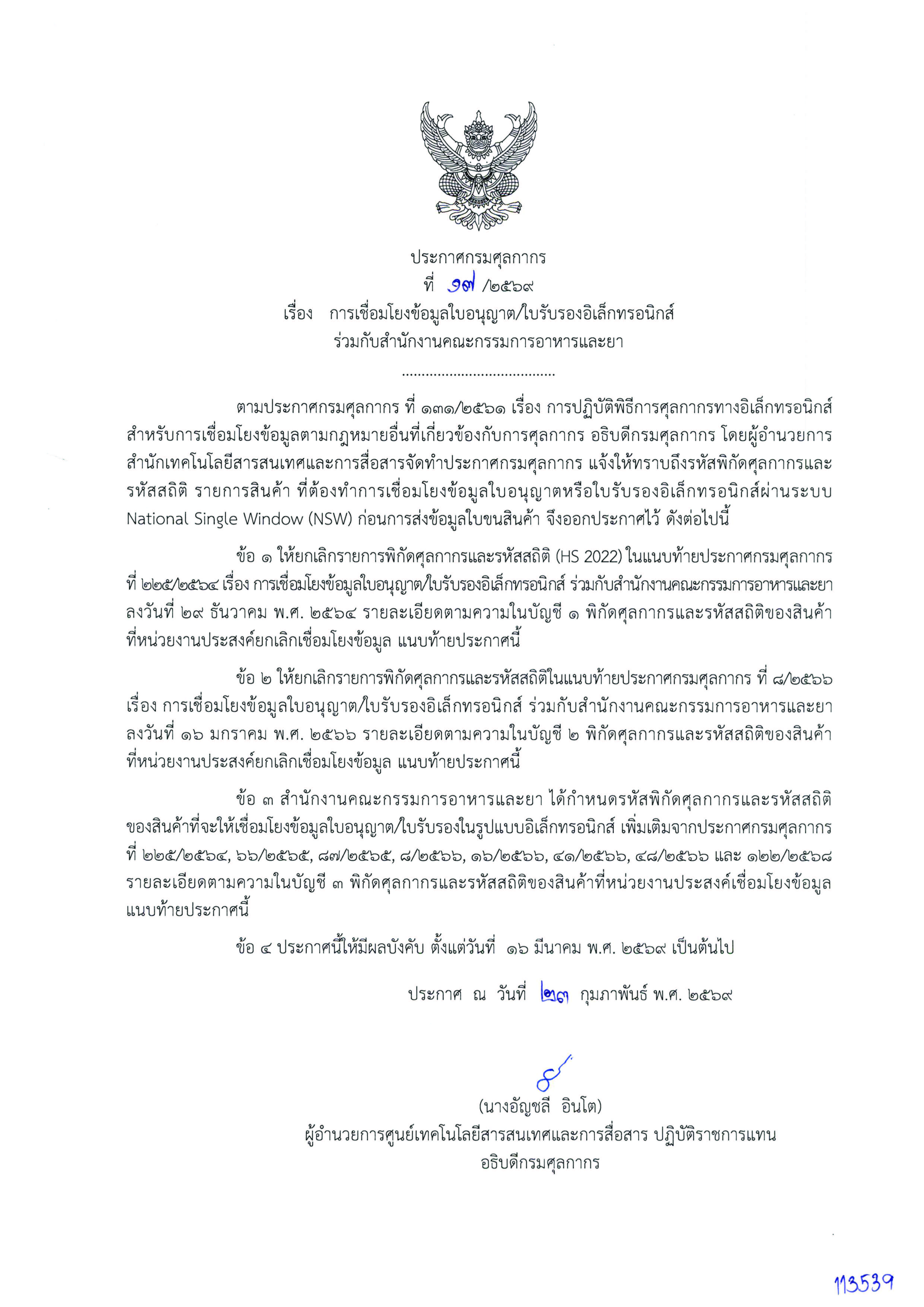 ประกาศกรมศุลกากร ที่ 17/2569 เรื่องการเชื่อมโยงข้อมูลใบอนุญาต/ใบรับรองอิเล็กทรอนิกส์ฯ