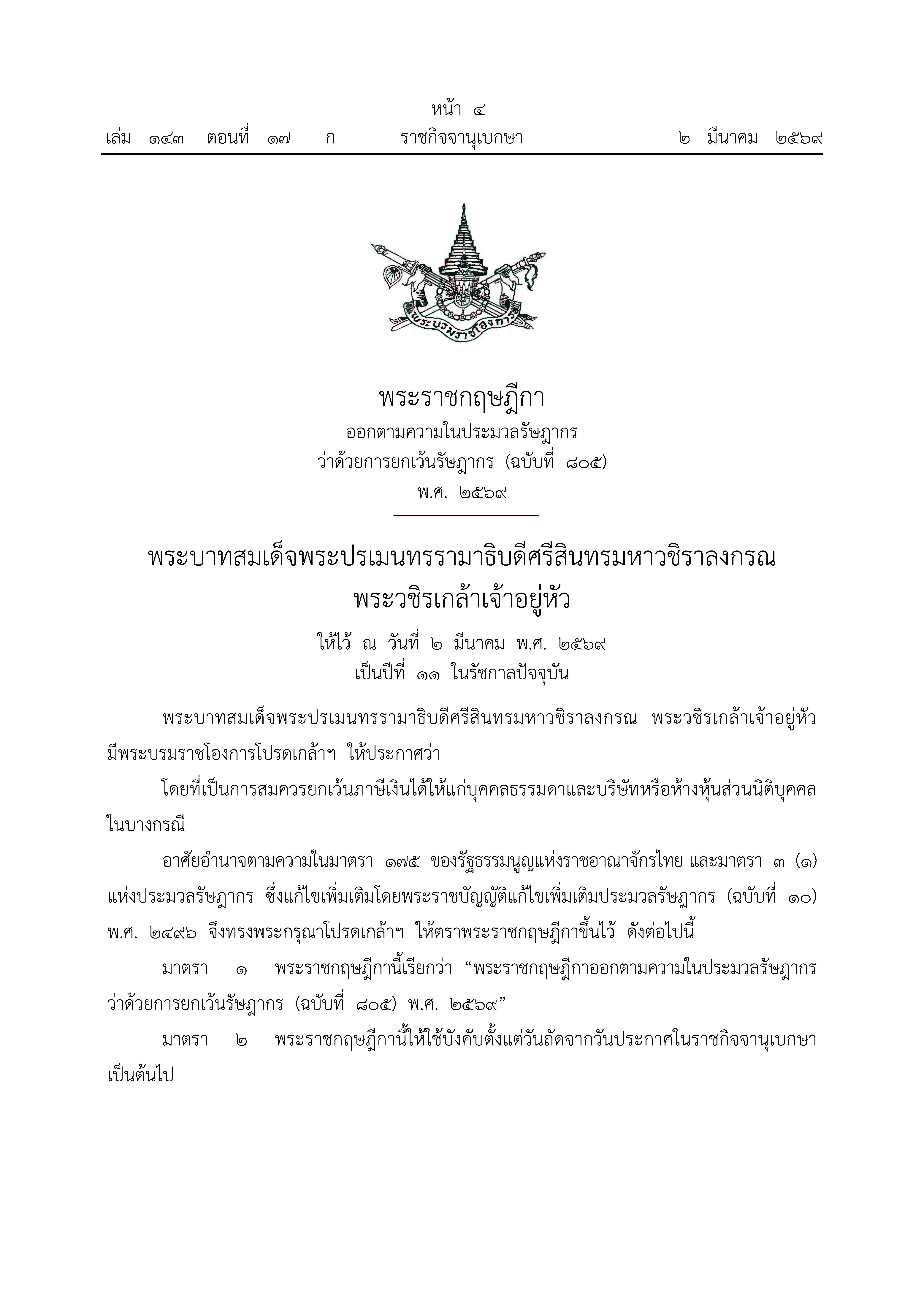 พระราชกฤษฎีกาออกตามความในประมวลรัษฎากร ว่าด้วยการยกเว้นรัษฎากร (ฉบับที่ 805) พ.ศ.2569