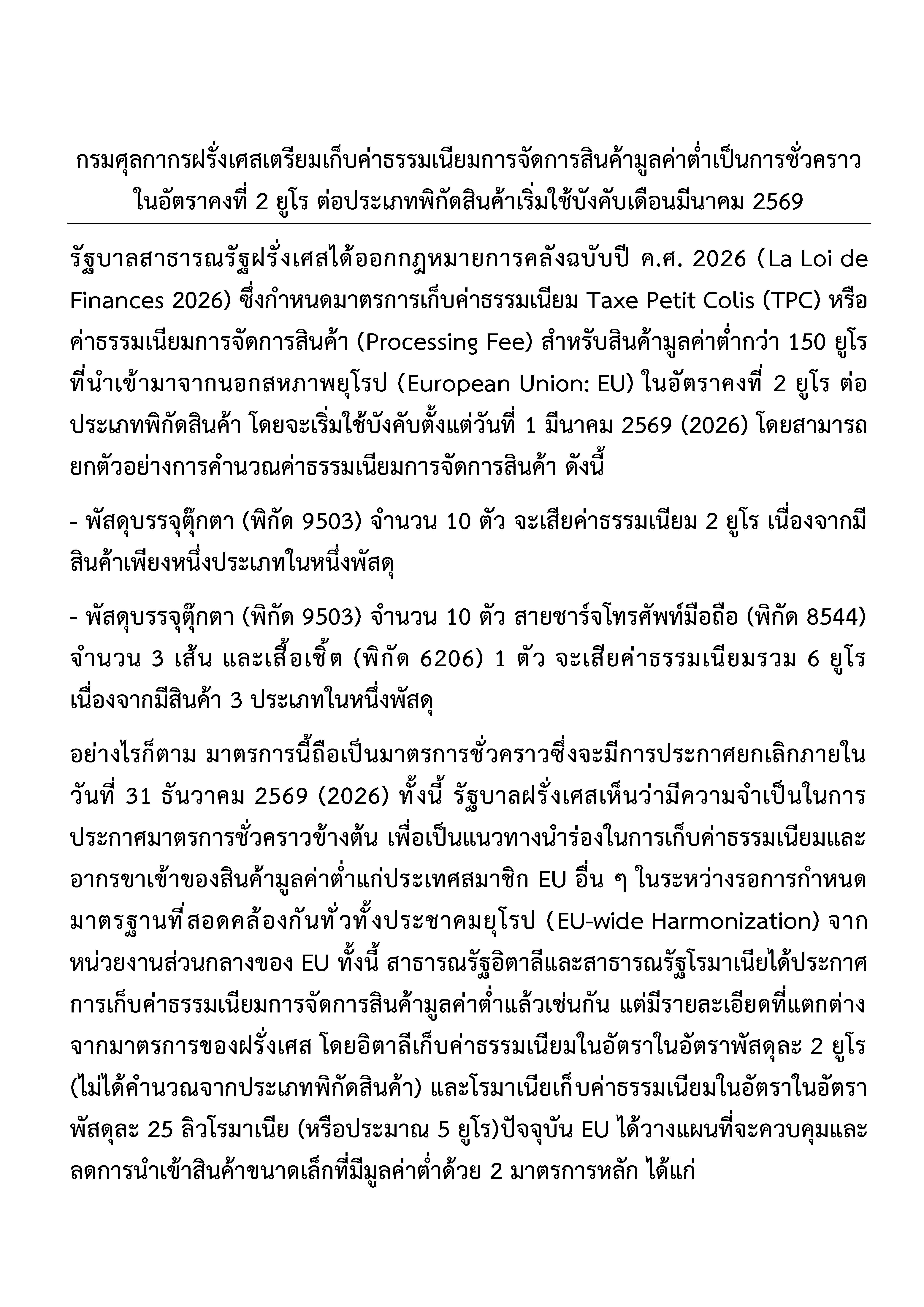 ประชาสัมพันธ์กรมศุลกากร ฝรั่งเศสเตรียมเก็บค่าธรรมเนียมการจัดการสินค้า มูลค่าต่ำเป็นการชั่วคราวฯ