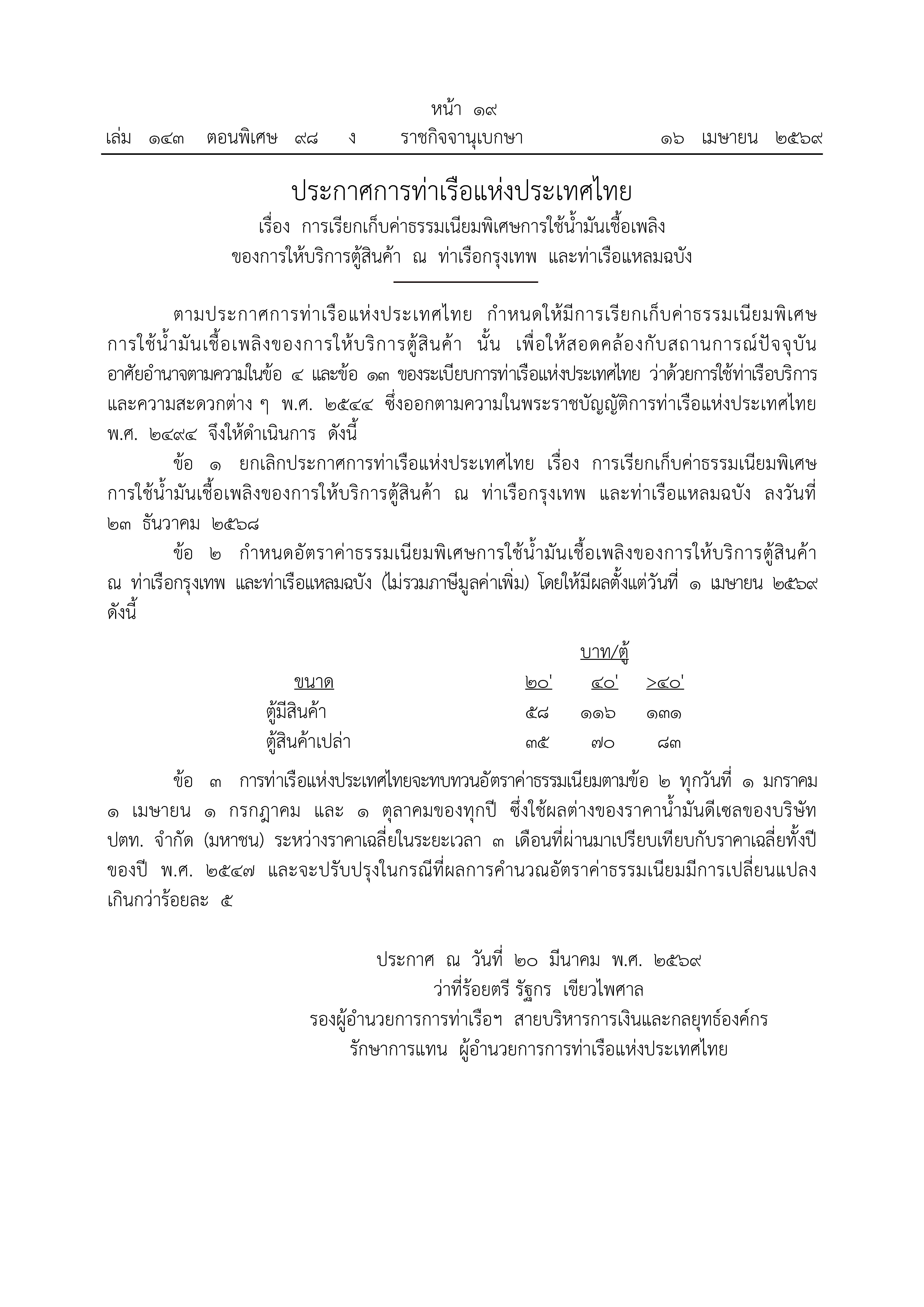 ประกาศการท่าเรือแห่งประเทศไทย เรื่อง การเรียกเก็บค่าธรรมเนียมพิเศษ การใช้น้ำมันเชื้อเพลิงฯ