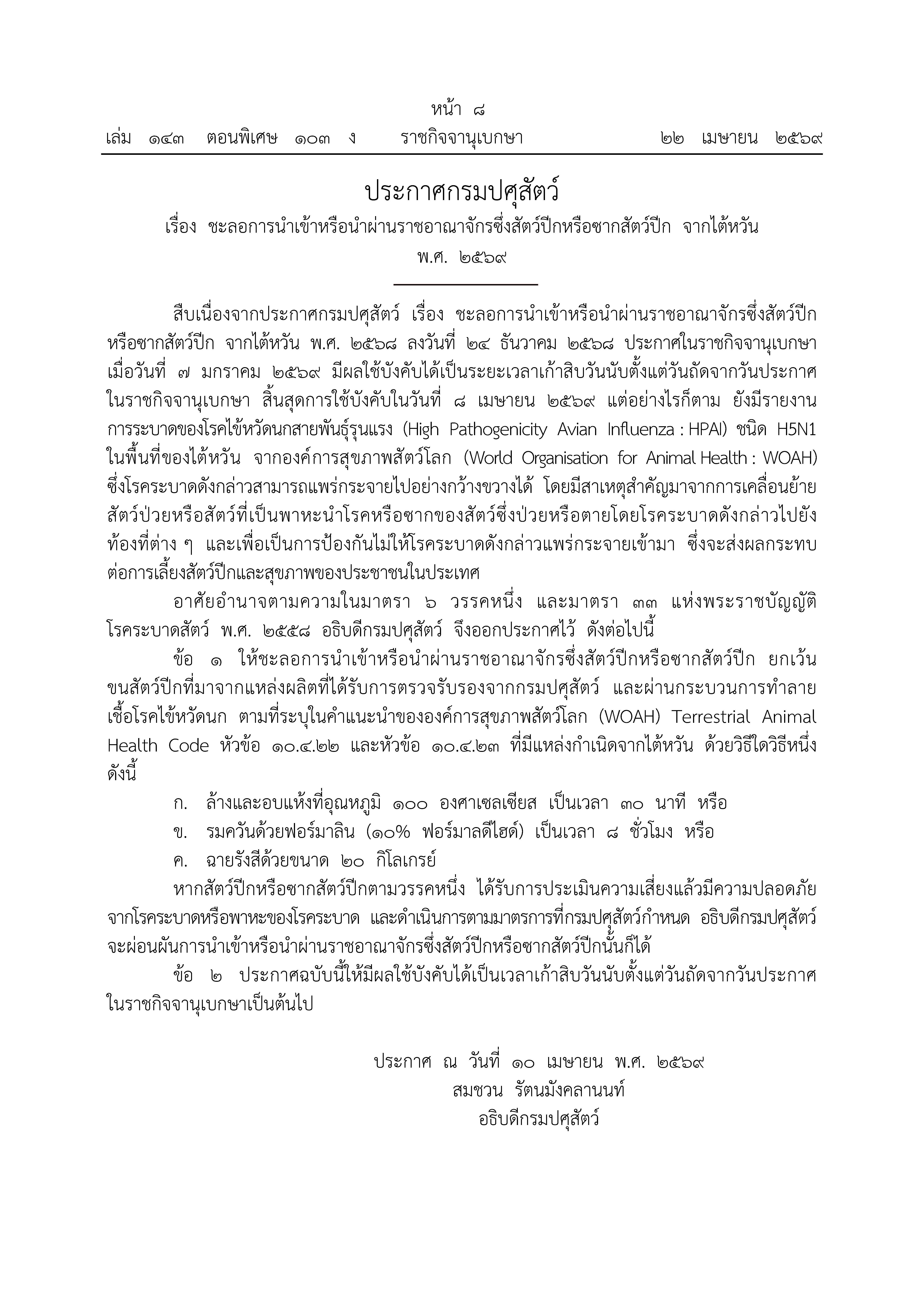 มาตรการคุมเข้ม! ระงับการนำเข้าสัตว์ปีก ป้องกันภัยไข้หวัดนก (H5N1)