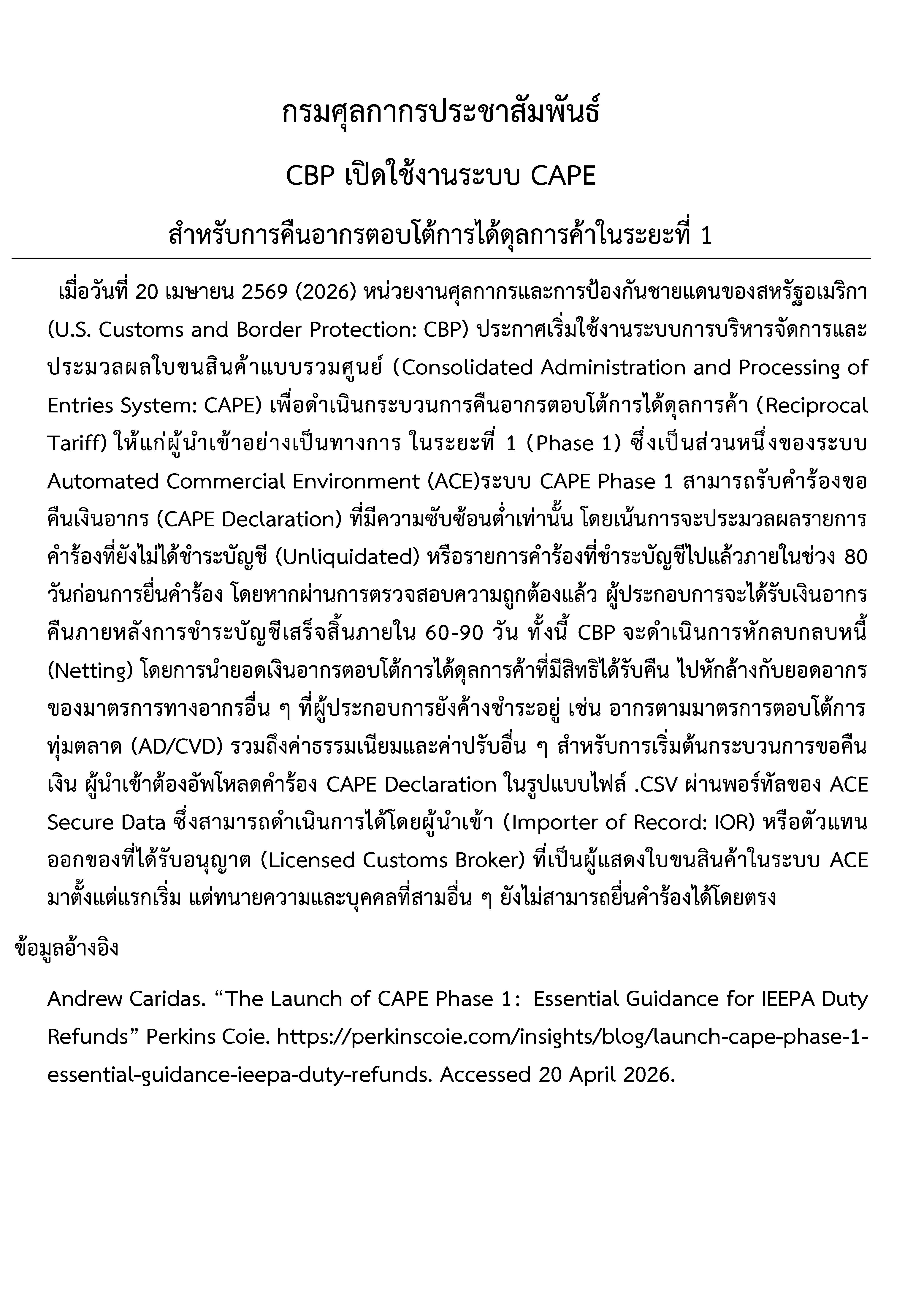 CBP เปิดตัวระบบ CAPE Phase 1 ขั้นตอนการขอคืนอากร Reciprocal Tariff ของสหรัฐฯ